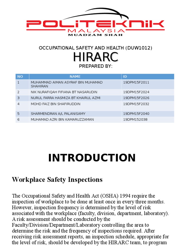 20 What is HIRARC 2 30 Workplace Assessment through HAZID Table 3 40 Custom-made of e-HIRARC 5 50 How to run e-HIRARC 5 60 Completing the e-HIRARC output 9 61 Additional information in e-HIRARC format 9 62 Prioritization based from risk rating 9 70 Saving Printing 13 80 Correction 13. Saravanan al sukumaran b071210044 tan khai joe b071210102 yoon boon hong b071210010 tian su yee b071210083 nurfazlina binti ramli b071210048 nurliyana binti mat aini b071210041 3. Tarikh borang HIRARC disahkan diluluskan-Disediakan oleh kumpulan staf HIRARC Team minimum 3 orang yang terdiri daripada Ketua Makmal Penyelia Projek staf yang mengendalikan aktiviti kerja staf yang telah menghadiri latihankursus HIRARC-HIRARC Team Leader telah menjalani latihan HIRARC.