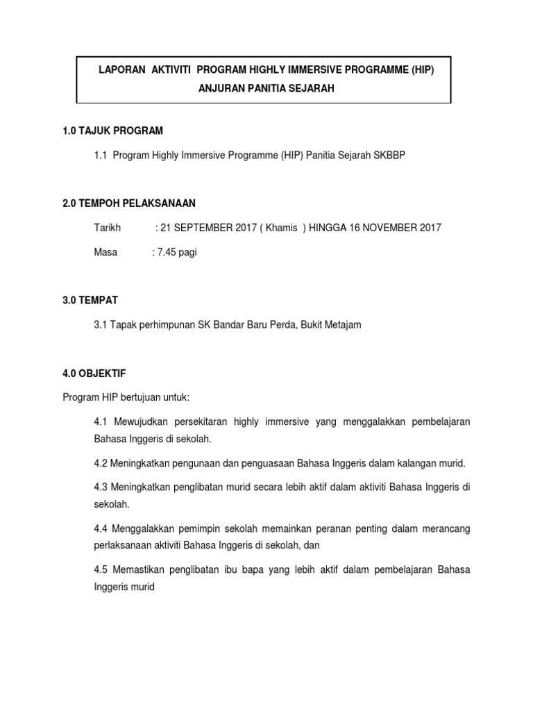 LAPORAN PELANCARAN PROGRAM HIGHLY IMMERSIVE PROGRAMME HIP 10 TAJUK PROGRAM 11 Majlis Pelancaran Program Highly Immersive Programme HIP Peringkat Sekolah. Pen Pal Project memperkukuh konsep Outreach sebagai satu usaha. Laporan aktiviti unit kebajikan 2017 1.