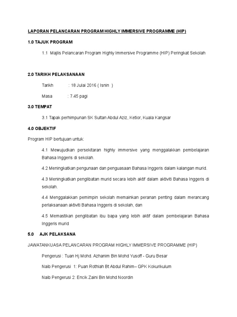 The Highly Immersive Programme HIP is a programme introduced under the MBMMBI policy that will improve the English proficiency of students through increased exposure in schools. Carta Organisasi Highly Immersive Programme admin April 22 2017 Seperti yang telah diceritakan berkenaan dengan HIP atau higly immersive programme antara perkara asas untuk melaksanakan dasar tersebut di sekolah adalah dengan mewujudkan carta organisasi atau jawatankuasa dahulu. 20 TARIKH PELAKSANAAN Tarikh.