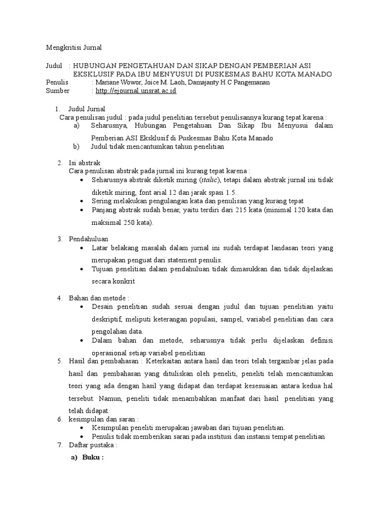 Contoh Tugas Kritik Jurnal Tugas 1. Contoh Saran dan Simpulan Pada Makalah Karya Ilmiah Laporan Kelompok - Pada saat membuat makalah karya tulis atau laporan penelitian maka salah satu bagian yang penting yaitu kesimpulan dan saran yang harus dibuat baik sesuai dengan format baku dari pembuatan makalah yang baik. Nama Penulis Fitria Ismali Universitas Negeri Gorontalo C.